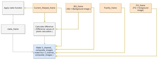 Figure 13 displays the results of four one-channel images generated from the input, background, foreground, facility, and CLAHE images. As 3-channel composite image is generated from concatenating three 1-channel images, the generated three-channel composite image exhibits different colors (Figure 13). Each one-channel image is shown via gray channel, whereas each three-channel image is shown via color channels.