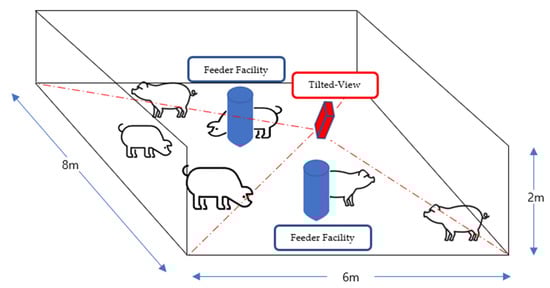 As deep learning methodology has improved over the years, the use of this technology in pig monitoring has increased. The detection of pigs under surveillance video [16] with suboptimal conditions [17] was studied to improve accuracy. Attempts have been made to detect posture [18] and count each pig within a pen [20] using deep learning. This technology allows for improved management of health issues in pigs [22,23,24,26]. More sophisticated methods have been introduced to address pig monitoring issues [27,31,32]. For instance, detection of pig posture was studied on a more specific level [28,33]. Testing the pig object detection under lighter hardware is also considered for overall process speed [34]. Reducing image noise can increase overall image quality, thus improving the detection accuracy for pig monitoring [35,36]. There are more pig farm images on different pig pen environments like a camera is installed with top-view [19] or tilted-view [21,30], but facility has not presented. There are also researches that detect pigs occluded by facility with tilted-view as well [25,29], but background and facility information has not been utilized.
