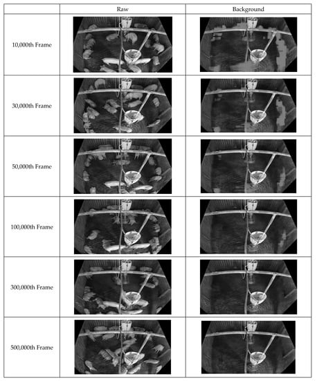 Because the cameras installed in pig pen are static, stationary facilities and objects (e.g., walls, feeders, and pipes) remain constant throughout the footage. Therefore, the stationary facility object like walls, feeder, or pipes all stay constant within the long period of time that the camera films. However, pig objects themselves continuously move and change position. Although the improvement from updating the background and facility information for each frame may be miniscule, accuracy may increase substantially as these changes accumulate. Therefore, the continuous fine-tuning of the background and facility information can improve object detection performance [25,29]. Furthermore, as the duration of footage increases, the accuracy of extracted information should also increase.