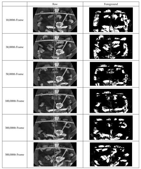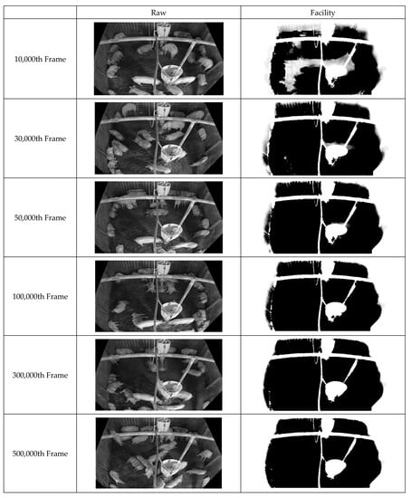 First, improved pixel-based background images were acquired by continuously inputting the box-unit object detection results through applying tinyYOLOv4 [41] to the video data. Figure 10 illustrates the background updating over time. Evidently, the background image gradually becomes clearer as noise is removed. Figure 11 displays the facility information collected from the pig pen. The algorithm for facility generation (see Figure 6) corrects the gaps and unclear contours caused by noise, thus improving the clarity of the facility image. Finally, a foreground image corresponding to the pig object is generated using the input and background images. Figure 12 indicates that this image also improves over time as the background image becomes more accurate. This pattern illustrates how the background image accuracy affects the foreground image accuracy.