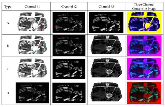Within the training dataset, “Color Image” denotes the original color images obtained by camera, whereas “Composite Image” comprises the images generated by the composite method. The model is tested on each three-channel composite image types and each 3-channel composite image dataset contain 200 images, which is each named “Composite Image A”, “Composite Image B”, “Composite Image C”, “Composite Image D”. The “Composite Image A + B + C + D” includes a total of 1600 images, with four images for each of “Composite Image” subsets forementioned and four images for each of four one-channel images generated from the input as mentioned in Figure 13. The model was tested on the reconstructed three-channel composite images. As a result, the proposed method improved accuracy by 5–10% on the overall test dataset compared to the baseline models. Likewise, overall TP, FP, FN, precision, and recall also improved.