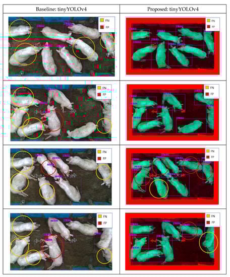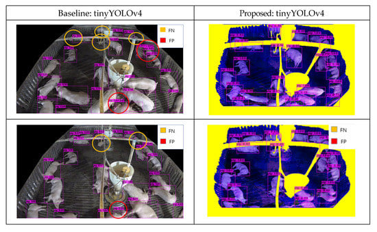 Table 2 and Table 3 present an accuracy comparison between the baseline (tinyYOLOv4 [41] and tinyYOLOv7 [42]) and proposed StaticPigDet. AP0.5 (average precision with 0.5 IoU) is a performance index used to measure object detection accuracy in benchmarks such as PASCAL VOC. Specifically, it indicates the average precision based on an intersection over union (IoU) of 0.5. Precision is calculated using the TP (true positive) and FP (false positive) cases, whereas recall is calculated using the TP and FN (false negative) cases. Subsequently, the average precision based on IoU is calculated using the inverse properties of precision and recall.