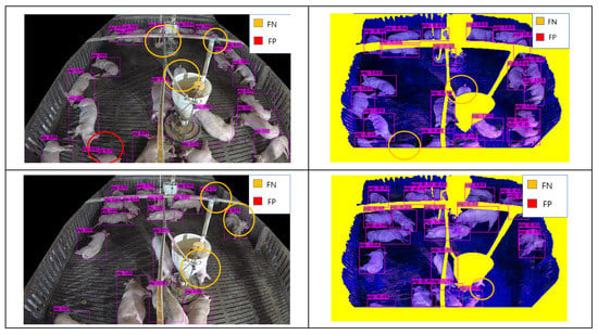 Many images collected from surveillance camera create different error cases. These error cases include pig object occlusion behind feeder facility and occlusion behind ceiling pipes. Many pig objects were not detected, resulting in FN results. By applying the composite image methodology, most, but not all, of these errors were resolved. Figure 14 presents the detection results for Composite Image A, wherein each error case was designated from the results. Although cases of body-separated occlusion wherein a pig object was split by an occluding feature, were handled accordingly, cases where part of the pig was cut off entirely, or pigs occluded each other, remained causes of error.