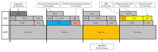 For each video frame, we need to execute Image Fetch (on CPU), Perspective Transform and NPPS & Composite Image Generation in the proposed method (on CPU), tinyYOLO (on GPU), NMS (i.e., Non-Maximum Suppression to delete similar boxes [38,39,40,41,42] (on CPU), and Background Generation and Facility Generation in the proposed method (on CPU), sequentially. For real-time processing, we use multi-core programming (on a multi-core CPU) and pipeline techniques to overlap multiple frames processing. With the incorporation of multi-core programming and pipeline techniques as shown in Figure 16, the CPU and GPU computation can be overlapped over multiple frames thus raising throughput on continuous video frames.