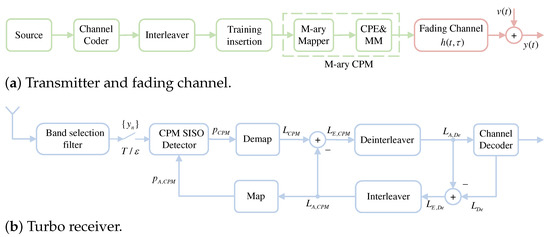 In the transmitter, a block of message bits is encoded with a channel coder and permuted with an interleaver to randomize the order of the code bits. Subsequently, specific training bits are appended to the codeword in the training insertion block, helping the receiver in locking fast and reliably. An M-ary gray mapper was considered to obtain a symbol sequence by the obtained burst (in bits). Then, short CPM bursts are generated by a continuous phase encoder (CPE) and a memoryless modulator (MM) and transmitted over the channel. The channel was completely specified by linear distortions, represented by impulse response and noise variance that was assumed to be known at the detector.