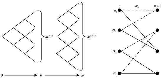 (left) Forward tree structure; (right) trellis diagram of the binary scheme with truncated length at time n.