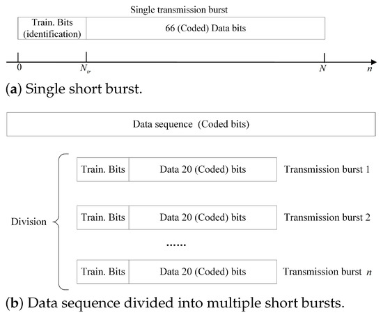 Short burst structure. (a) Single transmission burst at the output of the training insertion (TI) block with 66 payload coded bits. (b) Data sequence (in bits) is divided into n sequences of 20 bits, where each sequence was transmitted as a burst on a different channel.