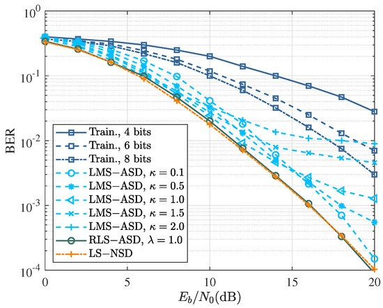 Compared to LS-NSD and RLS-ASD, the LMS-based ASD had much lower complexity and practical feasibility, but its performance was strongly influenced by the step size. The LMS-ASD with fixed step sizes of was selected according to Equation (27). BER curves show that the LMS-ASD with a greater achieved better BER performance than that of the smaller one in low , but reached an error floor at high . The results show that no error floor was observed for the LMS-ASD with , while there is a significant loss of performance at low .
