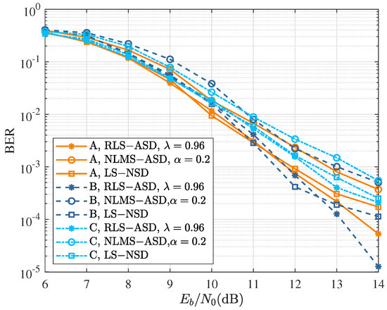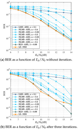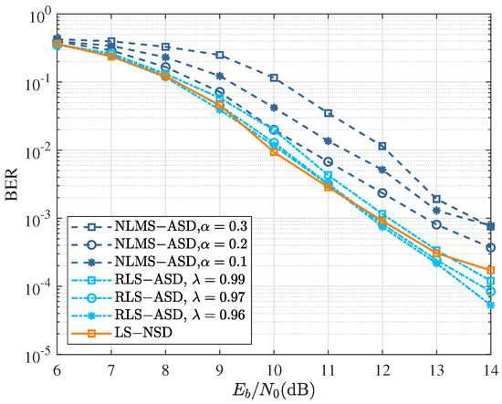 After the third iteration, the comparison of the BER curves using various symbol detectors is shown in Figure 6. The curve of LS-ASD reached an error floor, while the BER of RLS-ASD had an obvious downward trend along with . The performance of NLMS-ASD did not always increase with the decrease in parameter alpha, and the best performance was achieved with .