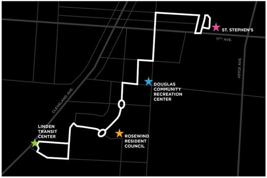 Emulating the European project, CityMobil2 [8], the early deployment of low-speed shuttles aimed as last- and first-mile solutions have taken place in Ann Harbor, Michigan [9], Arlington, Texas [10], San Ramon, California [11], and the Metro Phoenix Area [12]. In Columbus, Ohio, the smart circuit deployment of the Smart Columbus project operated in the Scioto Mile downtown area from December 2018 through September 2019 and provided over 16,000 rides with more than 19,000 miles traveled in [13]. The subsequent Linden AV deployment of the Smart Columbus project aimed at closing transportation gaps and providing access to public transportation, affordable housing, healthy food, childcare, recreation, and education was launched in February 2020 and was halted two weeks, due to an on-board incident and continued again afterwards. This project was named Linden LEAP (Linden Empowers All People) and distributed close to 3600 food boxes and more than 15,000 masks during the pandemic [13]. The Linden LEAP deployed autonomous shuttles had a static route and circled between the stops without on-demand capabilities. The static route of deployment is shown in Figure 1. Reference [14] analyzes the challenges faced by the Linden deployment. Some possible issues include slow speed or operation; high delays on route scheduling due to different traffic conditions; the handling of complicated obstacles such as non-signalized intersections; traffic circles and occlusions caused by these; trash pick-up; one street being too narrow for operation; and stopped vehicles and other objects such as trash cans on the road, which may cause stalling of the AV.