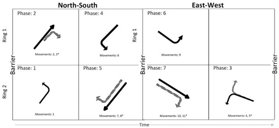 The first step was to divide the intersection phases into two groups which determine the placement of the first “barriers”. This can be performed by separating the phases into north- south and east–west phases. Next, the phases in each group were sorted based on the compatibility of the phases. That is, phases which are not compatible were further sorted into sequences which are called rings. The beauty of ring and barrier diagrams is that adjusting the timing for the traffic signals becomes easy as the length of the phases is adjusted at will as long as they are maintained inside their corresponding barriers. This allows for more traffic flow by allowing different phases to proceed and to be mix-and-matched. The next task is to decide the length of each phase. For this, the county was contacted for information regarding their traffic lights and these phases were adjusted accordingly. As an example, the diagram for the Cleveland and Eleventh Avenue intersection of the Linden area can be seen in Figure 2. In this way, the entire Linden area was adapted with ring-and-barrier signal intersections based on timings provided by the city on the main road. The map can be seen in Figure 3.