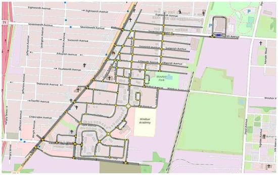 The Linden network of the Smart Columbus Linden LEAP autonomous shuttle deployment is used here to develop and demonstrate the RL taxi dispatcher. The approach for the validation model of the Linden network is to use an agent-based micro-simulation. Thus, the environment is first built; then, the environment is adapted with a fleet of SAVs, and consequently, the environment is adapted with a taxi dispatcher. The process to build the network is outlined in [35]. OpenStreetMap information was used to create a network version of the Linden area and with further work on intersections and areas of conflict, the network was ready for simulation. Ring and barrier systems were used to control the traffic lights. A ring and barrier system is a way to encode safe pairings of movements and define phases for control of the intersection. It was important to model such behavior as the network used for simulating was prone to traffic jams without the aid of traffic lights.