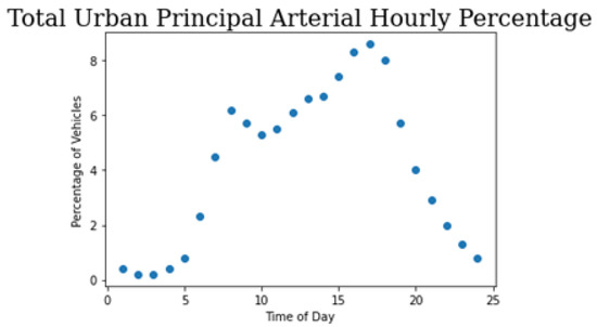 Furthermore, the network was calibrated based on vehicle capacity, route choice, and system performance. The necessary field measurements were obtained through the Mid-Ohio Regional Planning Commission (MORPC) site [36]. The data, however, were limited so many decisions had to be made to create a tuned network. The method for calibration used was to interpolate the observed information to populate base traffic for the whole network. The necessary vehicle inputs were placed along Cleveland avenue, Bonham Avenue, and Seventeenth Avenue. Next, routing decisions were placed along the network so as to minimize the GEH statistic observed where observed data were provided. The GEH statistic is a goodness-of-fit measure that quantifies the acceptable differences between field observations and simulation observations. An acceptable GEH statistic in a network is <5. Furthermore, temporal dependencies were introduced into the network by interpolating from provided Peak Hour to Design Hour Factor report [37]. This adjusts the total traffic in the network depending on time of day. An example of this distribution for an Urban Principal Arterial road can be observed in Figure 4.