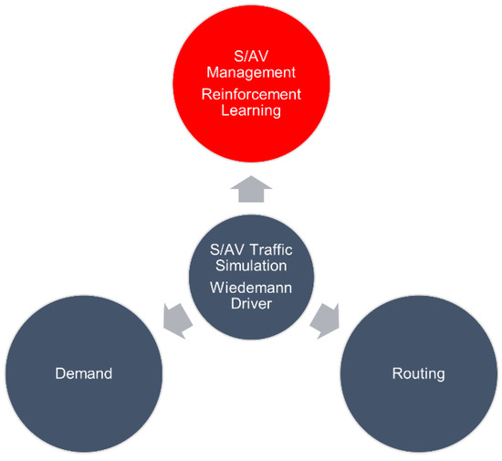 Next, the network was adapted with six SAV pick-up/drop-off locations distributed along the network. The base of the SAVs is assumed to be Stephen’s Community center as this is where the SAVs recharged and stayed during non-working hours during the real deployment. Furthermore, an extension of the simulation was built using the COM interface as is described in [35]. The main working modules include the demand module, which allows the simulation of passengers placing requests; the routing module, which creates the paths for SAV travel; and the SAV management module, which models the dispatchment of SAVs according to different algorithms. These algorithms will be discussed in a later section. The main three modules are interconnected by the traffic and SAV simulation, which updates at the same rate as the rest of the modules. This structure can be seen in Figure 5.