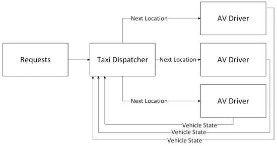 The simulation of SAVs begins by modeling an SAV agent. Each agent is regarded as an AV with an upper-level controller. The upper level controller receives requests from passengers with a time-stamp of when they are received. The upper-level controller is regarded as the SAV dispatcher and is tuned with parameters such as maximum wait time for pick-up and maximum wait time for drop-off. At each simulation time-step, requests are placed and the information is updated in the SAV dispatcher. The job of the SAV dispatcher is to send AVs to their destinations such that the number of passengers moved from stop to stop is maximized while the wait times are minimized. In this way, there exists one SAV dispatcher controlling a fleet of AVs and the SAV dispatcher hypothesized is a centralized dispatcher. An example of the regarded SAV dispatcher for three SAVs is shown in Figure 7.