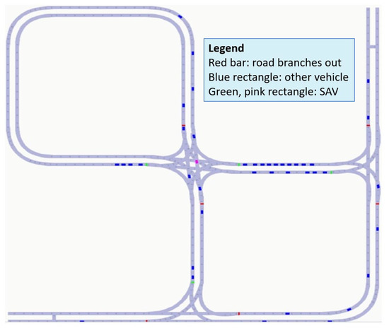 The difference between AVs and regular surrounding traffic is that the simulated AV vehicle will behave carefully in relationship to the surrounding traffic. The minimum distance, s0,i, is increased, and the reaction time, Ti, is decreased. Each AV introduced into the simulation was also adapted with a handle such that its behavior can be controlled from outside the simulation. The typical gymAI RL environments provides handles step, reset, and render while declaring the action and observation space. The simulation environment created provides these functions as object handles. Furthermore, pick-up/drop-off spots were also placed along the network as well as traffic light intersections to facilitate the flow of traffic. This resulted in the traffic simulator shown in Figure 10.