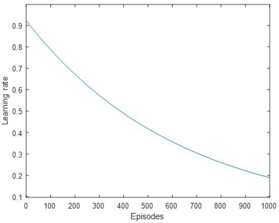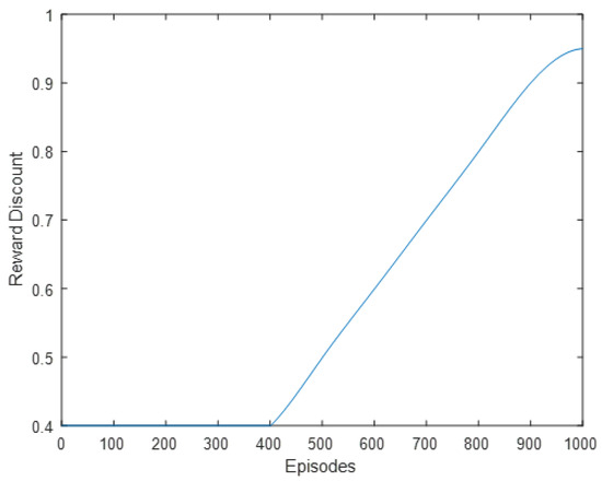 γ > 0 is the reward discount and represents how much weight current rewards have vs. past rewards. γ is set to 0.4 for the beginning iterations since the algorithm will count the immediate rewards much heavily than long-term rewards. Once training reaches above 400 episodes, it slowly increases γ until γ = 0.95. This can be observed in Figure 13. α > 0 is the learning rate and represents how fast the new Q-value observed is adopted. α is slowly decreased over time from 0.9 to 0.2. This can be observed in Figure 14. ε > 0 chooses the odds in which a random action is chosen, i.e., the exploration vs. exploitation rate. Figure 15 shows the chosen learning rate over episodes.