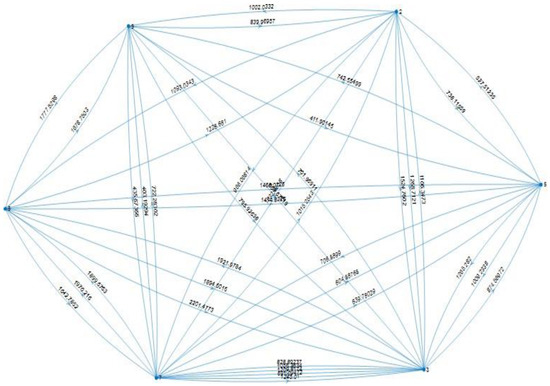 The handling of the network presented gives the abstract version of the Linden network shown in Figure 17. This is a directed graph with weighted edges equal to the distances between pick-up/drop-off spots in the network. The distance between a vehicle vi and a request reqt,i given its source stop, bup, d(reqt,i, vi) is given by the weight of the connected edge from the vehicle’s current pick- up/drop-off spot to reqt,i. This is always defined as it is computed a priori, at the beginning of the day. Furthermore, it is also assumed that there is always a path between nodes in the graph as shown previously.
