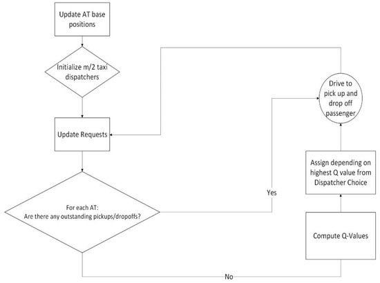 When six SAV are deployed, two RL dispatchers are used. Initializing dispatchers f1 and f2, the overall dispatcher, function f under policy π, is extended such that each one tends toward requests that will benefit each vehicle’s reward score. Let f1 control vehicle set vf1 = {v1,v2,v3} and f2 control vehicle set vf2 = {v4,v5,v6}. This choice was made to make the problem more tractable and to introduce cooperation within vehicle sets. In a multi-agent reinforcement learning approach, each SAV (agent) would be controlled separately, being motivated by its own rewards and taking actions for its own interests as opposed to the interests of the other SAVs.