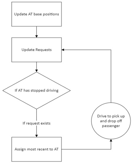 To obtain a deployable algorithm, the list of requests is appended with the drop-offs. Furthermore, a new variable Toff,MAX is defined as a soft drop-off deadline. In the simulations used, half the number of dispatchers as the number of deployed vehicles were used. The completed dispatcher can be seen in Figure 18.