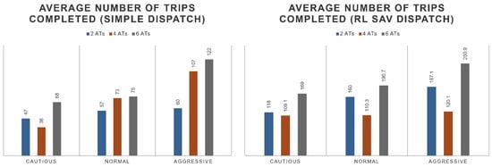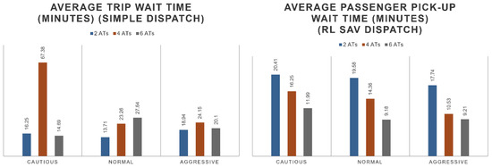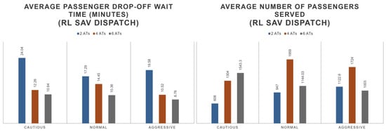 For the performance of the dispatcher, it can be observed that the number of completed trips double with the addition of the RL SAV dispatcher in comparison with a simple dispatcher. The dispatcher tends to flatten the performance of the distributed trips. This is shown in Figure 20. The average wait time is also optimized by the RL SAV dispatcher. The average wait time decreases to 10–20 min while the regular dispatcher sees wait times of up to an hour but of an average of 25 min. The fleet wait time performance linearly improves with the size of the fleet. See Figure 21 for details. In Figure 21, the average wait time of 2SAVs of simple dispatch is observed to be less than that of SAV RL dispatch in cautious and normal driving modes. The RL SAV dispatcher tries to maximize number of trips while minimizing wait times. Please note that for the two cautious and normal SAVs, the number of completed trips were much higher as seen in Figure 20 for the RL dispatcher as compared to the simple dispatcher. Since the cautious and normal SAVs have slow speeds, it takes them much longer to serve more trips trying to increase ridership with only two SAVs because of the larger travel distance per SAV that is needed. As the number of SAVs is increased, the higher number helps as the travel distance required per SAV to service more passengers is lower and the wait times are less for the RL dispatcher. It can be observed that the drop-off wait time of the fleet also linearly improves with the size of the fleet. The average number of passengers served is also linear with the size of the fleet. These observations are shown by the numbers in Figure 22.