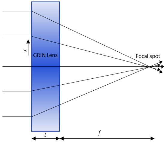 A GRIN lens consists of a planar slab with spatially varying refractive index as shown in Figure 1. Consider a plane wave that consists of parallel rays incident on a GRIN lens. The optical paths of the rays are curvilinear but can be approximated to linear paths for a very thin lens. Using geometric optics, the optical path p(x) of an arbitrary ray located at x can be written as [].