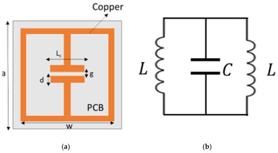 The unit cell used for the proposed GRIN lens is an electric-field-coupled LC (ELC) resonator first proposed by Schurig et al. [] and is shown in Figure 2a. This resonator has a split-gap at the center of the structure providing capacitance (which couples strongly to an applied electric field parallel to the split-gap) and two loops in parallel on either side to provide inductance in the structure []. An equivalent circuit of the resonator is shown in Figure 2b. The resultant resonant frequency  can be expressed as