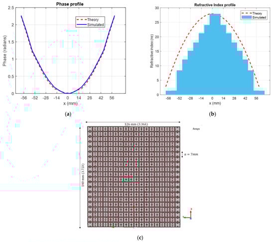 The desired phase profile of 1D gradient index lens of thickness 0.6 mm operating at 8 GHz for a focal distance of 110 mm follows (3) and is plotted in Figure 5a. The numerical phase shift results from the model-based parametric study were used to determine unit cells with appropriate split-gaps and obtain an approximation to the desired phase profile. The proposed GRIN metasurface lens design consists of 18 × 20 unit cells in the x-y plane as shown in Figure 5c. The lens has a total dimension of 126 mm (3.36λ) × 140 mm (3.72λ) × 0.6 mm (0.016λ). The simulated phase profile of the final 1D GRIN lens design is also plotted in Figure 5a. A higher phase shift is observed for larger split-gap unit cells as expected.