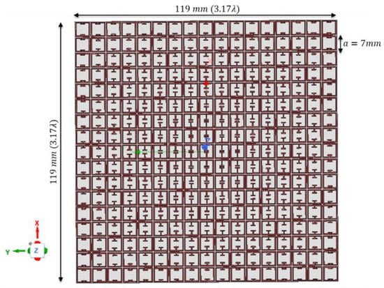 The GRIN lens described in the previous section has a gradient index in only one direction and hence the focusing action was in the azimuthal (horizontal) plane only. The same design concept was extended for a two-directional gradient metasurface lens design and is reported in this section. The focusing action for this case will occur in both the vertical and horizontal plane and hence a point focus can be obtained for microwave imaging applications. The proposed 2D GRIN lens design is shown in Figure 7 and consists of 17 × 17 unit cells with dimensions of 119 mm (3.17 λ) × 119 mm (3.17 λ) × 0.6 mm (0.016 λ).