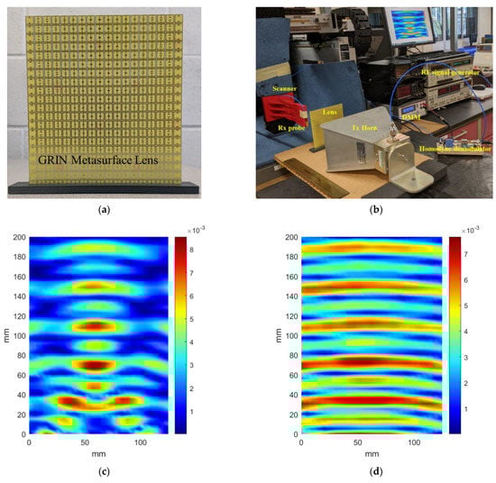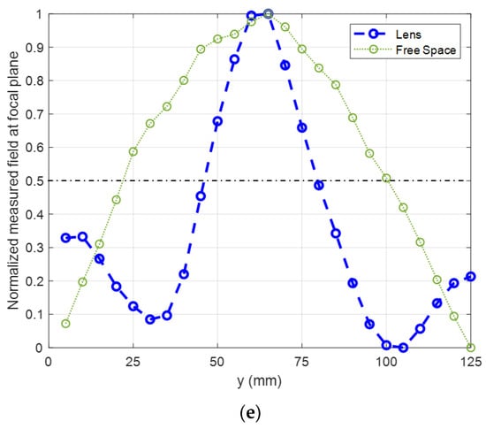 A prototype of the proposed 1D GRIN metasurface lens was fabricated at first for experimental verification. The fabricated lens is shown in Figure 9a. A homodyne detection scheme described in [] was used to perform microwave imaging experiments at 8 GHz. A wideband horn antenna was used as the source of plane waves. The horn was kept at 200 mm from the metasurface lens. A quarter wavelength monopole was used as the receiver to sample the field after it passes through the lens. The experimental setup is shown in Figure 9b. Figure 9c,d show the measured field distributions with and without the lens. From the plots, focusing action of the fabricated metasurface lens is clearly observed and they match well with the numerical results shown in Figure 6. The cross range field distribution in the focal plane (110 mm) with and without the lens is plotted in Figure 9e. The full width at half maximum (FWHM) at the focal plane with the lens is 33 mm (0.88λ) and is 77 mm (2.04λ) without the lens, indicating a resolution enhancement by a factor of 2.33 that is achieved with the 1D GRIN lens in the azimuthal plane.