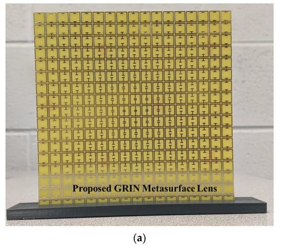 - Erfani, E.; Niroo-Jazi, M.; Tatu, S. A High-Gain Broadband Gradient Refractive Index Metasurface Lens Antenna. IEEE Trans. Antennas Propag. 2016, 64, 1968–1973. [Google Scholar] [CrossRef]