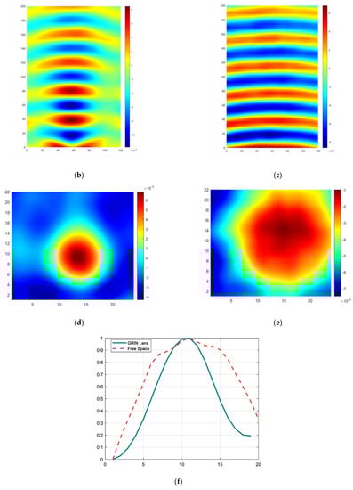 where  is the maximum refractive index at the center of the lens. EM waves can be approximated as rays using geometric optics for optical lenses as lens dimensions are many orders of magnitudes larger than wavelength of light. However, full-wave electromagnetic theory must be considered to describe lenses that operate at microwave frequencies. Wave analysis takes into account effects such as interference and diffraction which become significant when the size of the lens is comparable to the wavelength []. Similar to optical path analysis, the phase advance of all the rays from the incident lens surface to the focal spot should be equal in this case. For this, the spatial distribution of the phase shift,  across the lens should obey the following equation [].