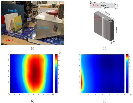 (a) Microwave NDE experiment setup. (b) Schematic of Teflon sample under test with machined groove. (c) Microwave imaging results of groove defect with lens and (d) without lens.