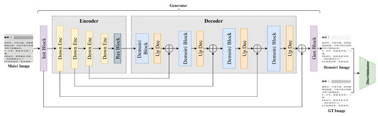 The overall structure of our proposed FSD-Net is shown in Figure 1. As can be seen, our network consists of a generator and a discriminator. The generator is a U-shaped network with skip connections between the encoder and the decoder. In the encoder, we adopt four down encoder Blocks and a res block to encode the multi-scale moiré image features. Using the decoder, we gradually remove the moiré patterns from the multi-scale feature maps both in the frequency domain and spatial domain by our proposed demoiré block. The discriminator is designed following the structure of [30], which can help further enhance the quality of the generated images.