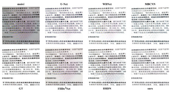 Figure 5 shows the visual results with serious moiré patterns. It can be seen that MBCNN cannot reconstruct text details, resulting in image blur. FHDeNet and HRDN cannot perfectly remove moiré patterns. U-Net and WDNet also cannot obtain an ideal demoiréing performance. Our proposed FSD-Net greatly outperforms the above-mentioned methods and generates a superior visual performance. The visual comparisons further confirm the effectiveness of our method in terms of preserving high-quality details while eliminating moiré patterns.