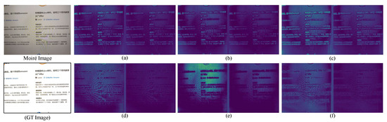 To verify the impact of our proposed frequency domain demoiré block, we show the comparison results between the original feature maps and the weighted feature maps by the frequency domain demoiré block. The visualization results are shown in Figure 7. We can see that: (1) in the first row, the left side of (a), (b), and (c) mainly activate the image content, while the corresponding weighted suppression effects in the right side of (a), (b), and (c) are not obvious; (2) In the second row, the features of (d) and (e) mainly represent the moiré regions, so that the weighted suppression is relatively significant. The feature of (f) contains the image content and the moiré content. Our proposed frequency domain demoiré block can effectively identify and suppress the moiré feature. Such visual results prove that our proposed frequency domain demoiré block can assist the model in recognizing and suppressing moiré features.