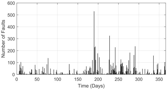 In this paper, the evaluation of the history of recorded faults is in relation to the year 2020 (from 1 January to 31 December), and this history corresponds to the sum of all the faults of the distribution branches in the Lages region (Brazil) based on data provided by Centrais Elétricas de Santa Catarina (CELESC). In total, there were 366 days recorded, considering that the year 2020 was a leap year. Figure 1 presents the sum of the alarms regarding faults per day in this period.