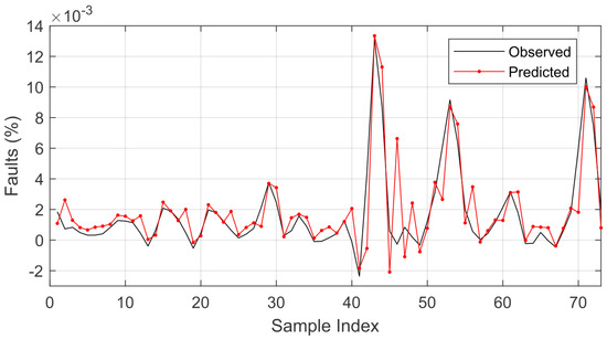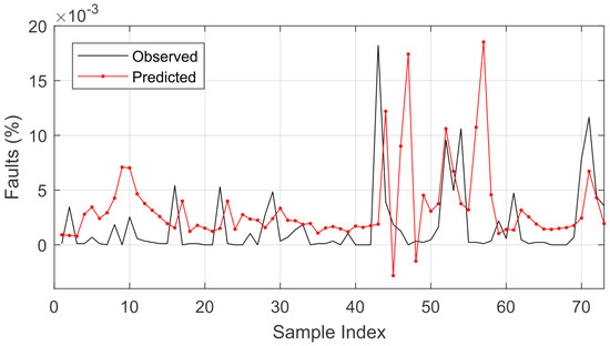 Using 80% of the data for training and 20% of the data for testing gave the best RMSE and R values, and hence this ratio was used in further analysis. As can be seen in Figure 4, there was major difficulty in predicting the data due to the nonlinearities in the time series, considering that in some cases, there were several failures in a short period of time.