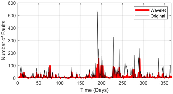 where P represents the steps forward and is the period of the samples. In this paper, is equal to 1 day, where all faults of the same day were summed. In this paper, one-step-ahead prediction was used (P = 1).