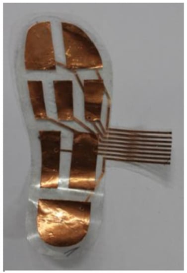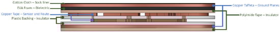 The layers introduced above adhered to each other using pressure-sensitive adhesives. Some materials selected already contain a layer of pressure-sensitive adhesive, these being polyimide tape, plastic backing, and copper tape. The bottom copper taffeta is adhered to the plastic backing using polyimide tape. The top copper taffeta was adhered to the cotton cloth (sock liner) by an iron-on fabric glue interfacing. This is a heat-sensitive material that melts and is usually placed between two non-adhesive materials (mainly fabric) to bond them together. The top sensor layer and the bottom route layer were connected using a conductive thread which is secured on its corresponding track route by a piece of polyimide tape (Figure 5). This was then inserted in the through-hole and secured by copper tape on the top sensor layer. The completed sensor assembly was then connected using a 9-way connector to enable attachment to an electronics unit so that it could read the capacitance changes when force was applied. Moreover, this sensor is intended to build inside the shoe. This sensor assembly could adhere to any outsole or midsole of the shoe assembly.