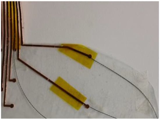 The thread fed through the hole is secured with conductive tape to ensure contact with the sensor pads (Figure 5 and Figure 6).