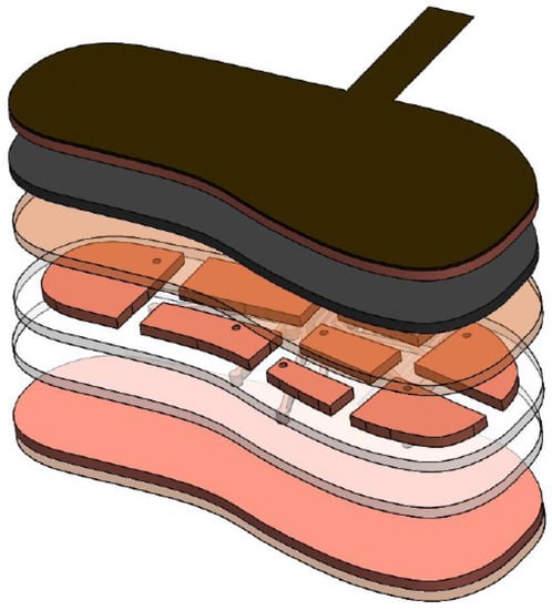 This included the mechanical design and development of the sensor assembly comprising of the development of sensor topography/shapes and location, evaluation of materials and manufacturing techniques suitable for the creation of the sensors, and the assembly of the sensors. The plantar pressure sensor was aimed to measure the overall plantar pressure. To do this, the sensor needed to be fixed in a location where it is going to experience minimal movement during the child’s dynamic activity. The plantar pressure sensor was placed in the Strobel area, located between the insole and the midsole of the shoes. Herein, the sensor was fixed (i.e., not loose) preventing it from moving around. Having the sensor fixed in place decreases the amount of environmental noise hence a cleaner signal. This area was also ideal as the sensors can be layered with other protective materials, such as EVA and other lining materials. In this work, the sensor was not tested while it is inside a shoe. Instead, the characteristics of the layers on top of the sensor are observed and characterized.