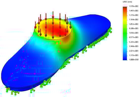 A testing jig was set up with the use of a machined foot phantom so that it can spread pressure evenly throughout the 8 sensors to validate the repeatability of the sensor, Before machining, a deflection analysis was carried out in SolidWorks to see whether three 18 mm panels of MDF would fail under 100 kg of load 100 kg is chosen because a Factor of Safety of 2 is assumed together with a 50 kg body mass. A load simulation was done using SolidWorks Simulation studies, to verify that 54 mm thick of MDF is enough to withstand 100 kg loads. Figure 9 shows that the most displacement was 0.0157 mm. This small deflection ensured uniform load across the sensors during testing.