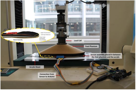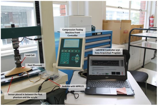 - Testing, Validation, and Calibration—After the sensor was manufactured, it was tested to see whether any connection faults were present. Data was logged and visualized using LabVIEW after the plantar pressure sensor was connected to Arduino and the MPR121 electronics unit. This test was referred to as Validation Testing 1 (VT1). Following calibration curves derived from the plantar pressure sensor system, calibration was performed. This was achieved with the repeated loading of the sensor using controlled instruments. Hounsfield H10KS Tensile Testing machine was configured as a compression testing machine to apply loads to the sensor. This stage was referred to as Validation Testing 2 (VT2).