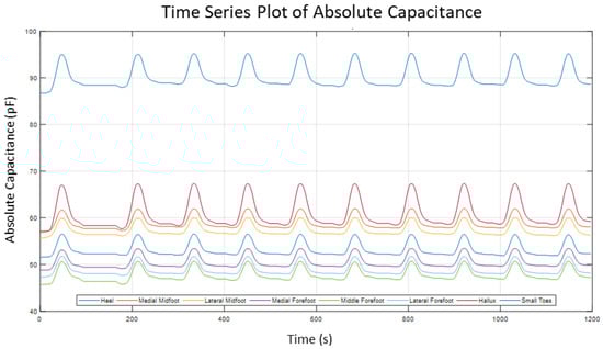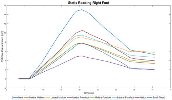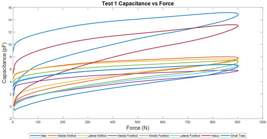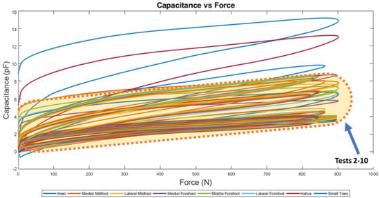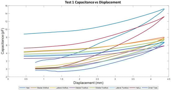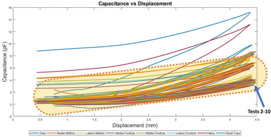 When tests 2–10 were performed, the curves now have relative capacitance readings between 0–6 pF (Figure 16). The test 1 result is disregarded because the data trend obtained by the hallux and heel does not follow the results obtained by tests 2–10 as highlighted in Figure 16.