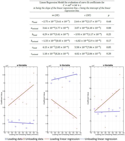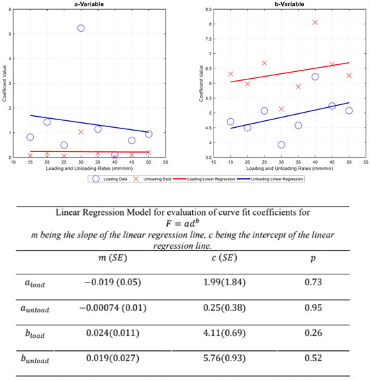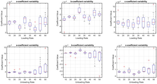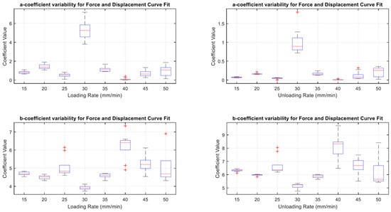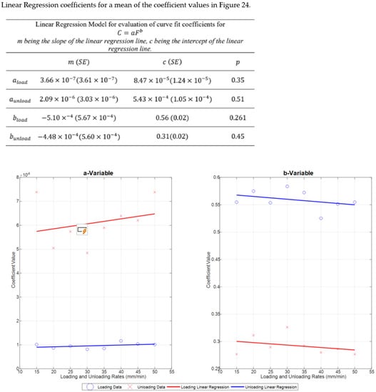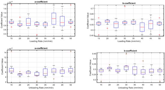 The variability of coefficient values per loading rate showed fluctuating ranges as shown in the spread in Figure 19. In the same figure, coefficient ‘a’ showed broad variability at both loading and unloading rates of 30 mm/min, compared to the rest of the loading rates. The ‘b’ coefficients showed a less consistent range throughout the different loading and unloading rates.