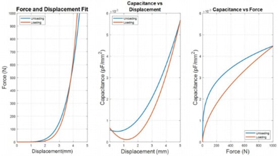 Both capacitances vs. displacement and capacitance vs. force showed a large space between the loading and unloading curves, even though unloading lines were expected to overlap and be in the same place as the loading lines for Figure 25. This behavior indicated that the readings from the sensor during loading are not the same during the unloading phase. The hysteretic condition is more evident when capacitance is plotted against force and displacement.