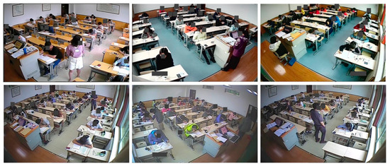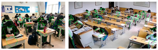 In classroom scenarios, the problems of student limbs being obscured by desks and overlapping between students in classroom images can pose a considerable challenge to pose estimation, and poor accuracy of pose estimation results can also result in poor data quality for downstream tasks. Lin et al. [7] designed a behavior recognition system that used the OpenPose framework [8] to obtain skeleton data, a correction scheme was proposed to reduce false connections, and then the skeleton data was modeled into different categories and action recognition was implemented using a classifier. Xu et al. [9] proposed a method for head pose recognition based on Euler angles obtained from pose estimation. Yu et al. [10] collected a classroom scenario dataset in a video game image called SynPose and employed a generative adversarial network (GAN) [11] to generate skeletons for transfer learning. However, it is not publicly available, and thus, we cannot conduct any experiments on it. From previous studies, it can be seen that no work has fully investigated the problem of pose estimation, and the accuracy of it is non-negligible as an upstream task for subsequent action recognition. Moreover, to the best of our knowledge, there is no publicly available dataset to encourage a data-driven student pose estimation in classroom scenes. In this study, we collected surveillance image data from classrooms and proposed a new dataset named Class Pose to provide a benchmark and a method dedicated to addressing occlusion problems in classroom scenes. Since this dataset involves students’ personal information, the images have been specially processed, as shown in Figure 1.