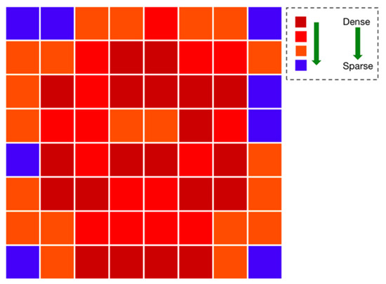 Different from the above shuffling strategy in the original MAE, we statistically calculated the distribution of all keypoints in the MS COCO dataset, as shown in Figure 3. The distribution heatmap was formed into an 8 × 8 chessboard; from dark red to blue, the blocks indicate the decreasing distribution probability of keypoints in this region. The calculation details about the probability of each block were as follows: (1) we mapped all of the keypoints from the MS COCO dataset with different sizes to the same size, which was a 256 × 256-pixel area; (2) the 256 × 256-pixel area was further transformed to 8 × 8 blocks (32 × 32 pixels for each block), we counted the number of keypoints fallen inside each block, and sorted them in descending order; and (3) according to the number of keypoints in each block, we graded them and then divided the 64 blocks into four different probability heat levels. From high to low, the blocks appeared as follows: 20 dark red, 16 bright red, 20 orange, and 8 blue. The significance of the heat level design was that they were the reference for selecting patches in the next step of the random masking.