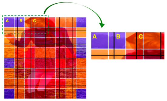 where Wi denotes the weight of the ith patch; AiDR, AiBR, AiO, and AiB represent the block areas with dark red (DR), bright red (BR), orange (O), and blue (B) that the ith patch occupies, respectively; and the weight of the ith patch is the sum of areas times their weights. As shown in Figure 4, the input image was divided by several black lines, and then three patches A, B, and C were selected as an example, where patch A occupied approximately 1.3 blue blocks and 0.44 orange blocks, which had a weight of 2.18. Similarly, patch B had a weight of 3.33 and patch C had a weight of 4.2. Once the weights of all patches were obtained, we selected the patches that should be masked out, and an accumulated weight was calculated as follows: